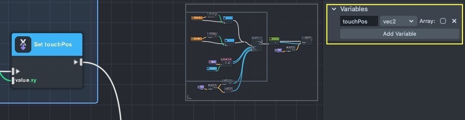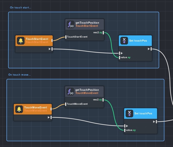 First, we use the TouchStart and TouchMove event and the getTouchPosition node to get the currently touched position. Then we set it to our variable touchPos which is a vector2.