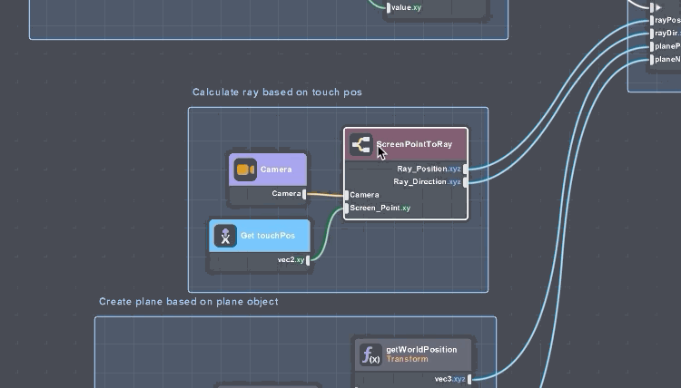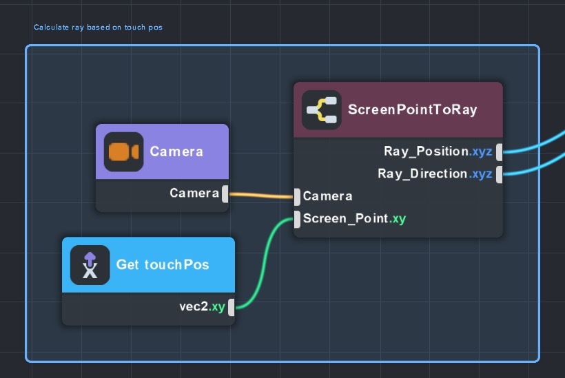 We’ll use the touchPos variable that we set with our touch events to get a ray that is perpendicular to the screen with the ScreenPointToRay node which outputs the position of the ray, and the direction it is facing.