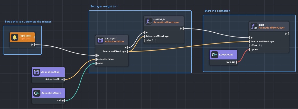 The Tap to Trigger Animationgraph triggers an animation with specified animation layer names and loop counts as input fields from the inspector when screen is tapped.
