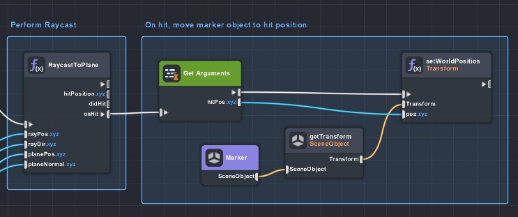 Then we’ll use the GetArguments node to get the argument in the hitPos variable from the function onHit. Then we’ll apply that position variable to our object Marker with the setWorldPosition node.