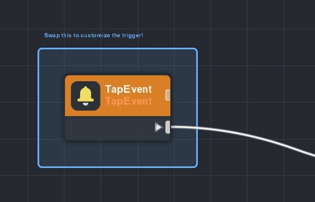 On the far left of this graph you will find the Tap Event--meaning that everything connected to this node will be called when a tap occurs. This node can be replaced by any event node such as Update, MouthOpenedEvent, or SmileStartEvent.