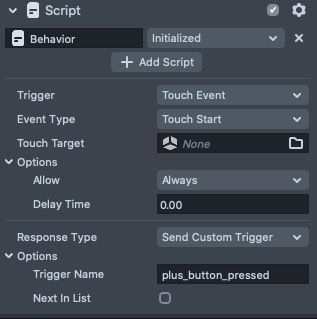On the +1 and -1 buttons, we can find a Behavior script that’s sending out custom triggers ‘plus_button_pressed’ and ‘minus_button_pressed’.