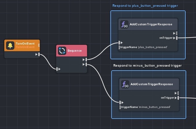 We know these triggers will be sent out to the entire project when the related button is pressed. In the Custom Trigger Scoring Script Graph, we have 2 AddCustomTriggerResponse nodes with the corresponding triggerName.