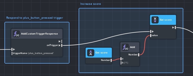 Then, we’ll link each of the onTrigger function to a simple logic to add (or minus) 1 to the score variable.