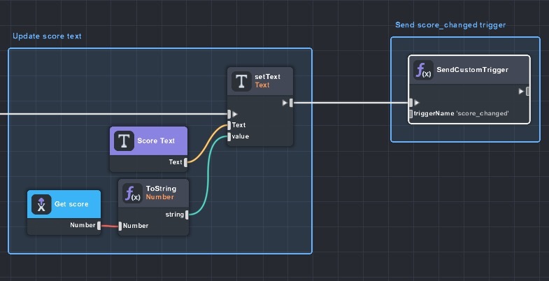 In the end, we’ll use the score variable to update the text input field. Then we’ll also send out a custom Behavior trigger ‘score_changed’ with a custom node SendCustomTrigger.