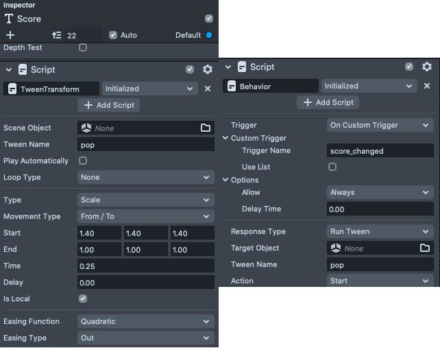 The reason we need to send out a custom trigger is to run a tween animation when the number on screen is changed. So we have a Tween + Behavior script combo set up on the Score object where the Behavior is set to be triggered by the trigger name ‘score_changed’.