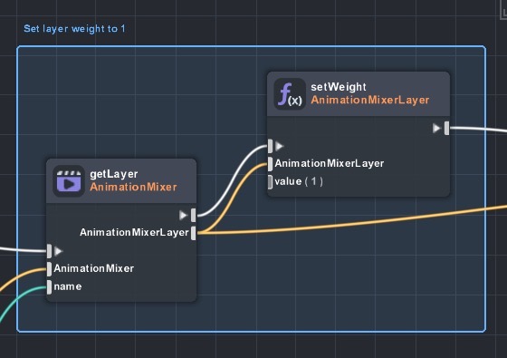 Then in the graph we’ll use the getLayer node to get the specific layer of the animation, then the setWeight node to set its weight to 1 so the animation will be visible.