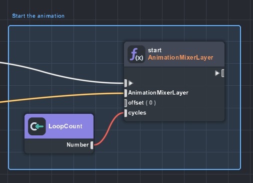 The last bit of the graph is the part that starts the animation-- the startAnimationMixerLayer node. We’ll also give it a loopCount of 1 so the animation plays one time.