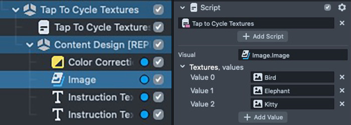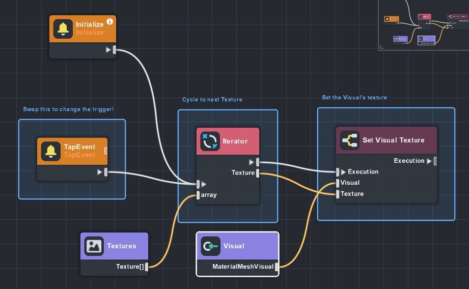 The Tap to Cycle Textures graph works with similar logic: User taps > calling the Iterator that loops through an array input > output result from the iterator to a SetVisualTexture node which sets the main texture of a MaterialMeshVisual element.