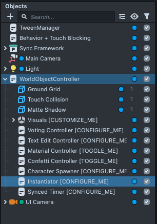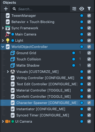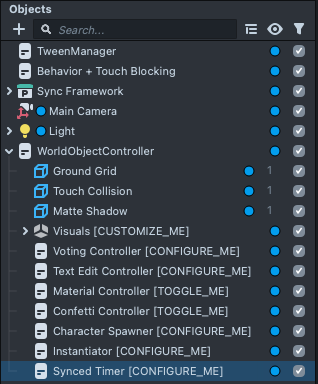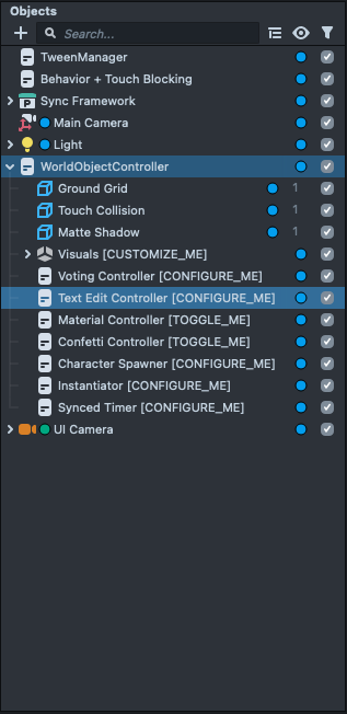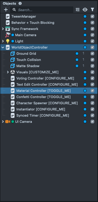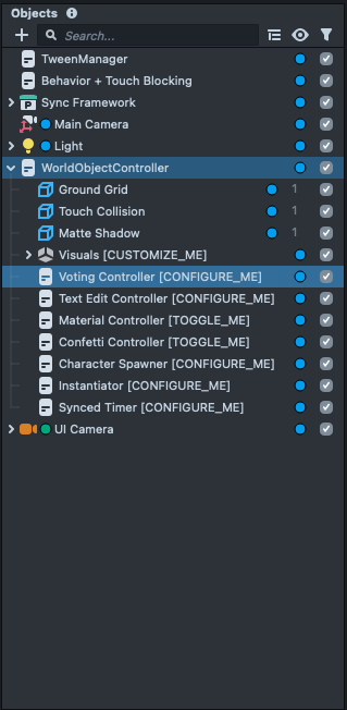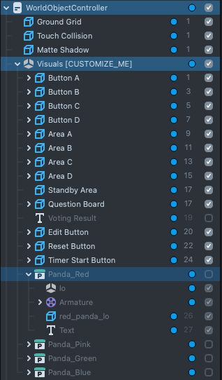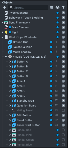 In this template, there is a setup that looks like a tabletop game board. In the Objects panel, if you expand the Voting Board object under the SceneRoot, you will see the Visual object being placed under the WorldObjectController as a child of it. The Visual object contains the visual elements used in the voting board, including: