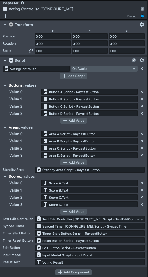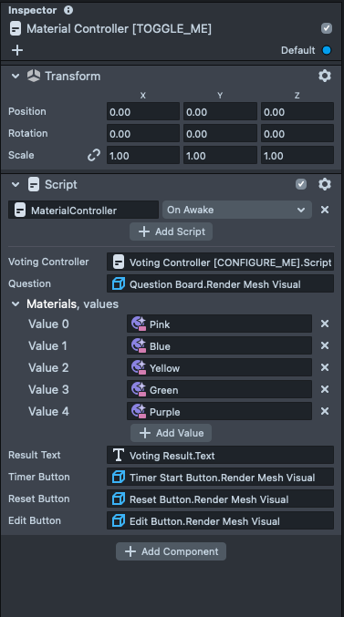The Material Controller allows you to set up what objects in the scene you want to change materials based on the voting result, and what materials you want as the candidates to be voted for. In this example set up, the materials on the question board, the result text, the timer text and a few buttons will change if there is a single color option that gets the highest voting score during the voting time, meaning there is a single winning group, not tied.