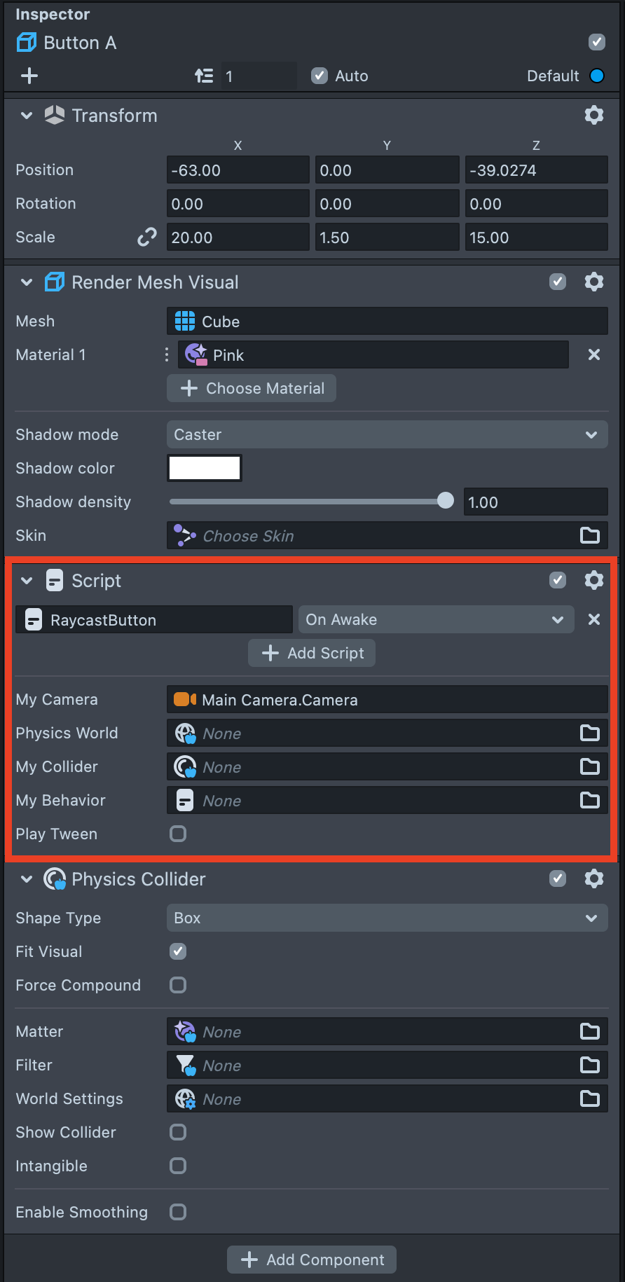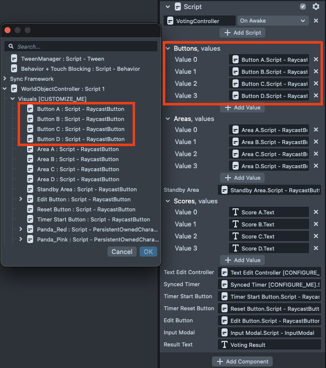 Buttons: This group of inputs allows you to set up which buttons in the scene should respond to user taps. By adding the RaycastButton script component of those buttons into the input field, you are updating voting counts based on tap interactions on those buttons.