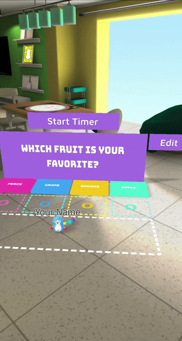 The voting template shows you how to use Sync Framework to build an AR experience that allows multiple users to contribute their input for selection in a shared session. This template is a good place to start with if you want to build a lens for voting, quiz games, or anything else that requires selection input from multiple users, with each user being represented by a character in the session.
