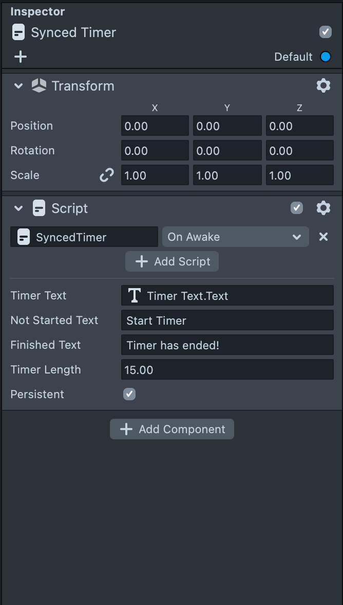The Synced Timer script talks directly to the Voting Controller script to determine the status of the voting depending on which stage of the timer is currently on. It is useful as it makes it easy to sync data between all users based on the status of the timer, and makes it possible to reset the voting session back to the initial status when we need to.