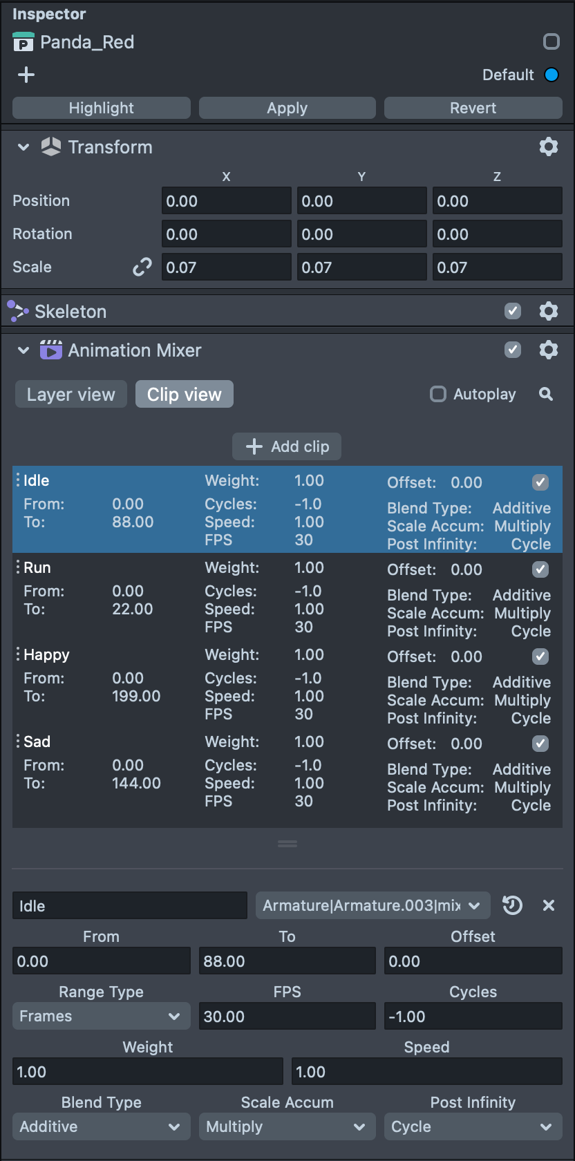 Each example character prefab contains an animation mixer set up in the same way. There are four animation clips in the animation mixer, arranged in the same order: Idle - Run - Happy - Sad.