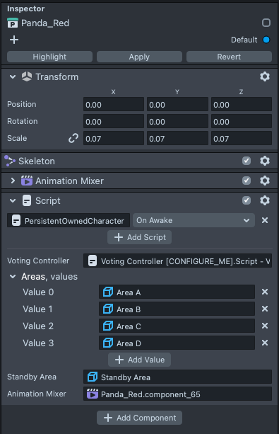 The PersistentOwnedCharacter script component on each character prefab also provides a few input fields. Those input fields plug in the VotingController scripts, the Areas for characters to move around, and the Animation Mixer that contains the character animations.