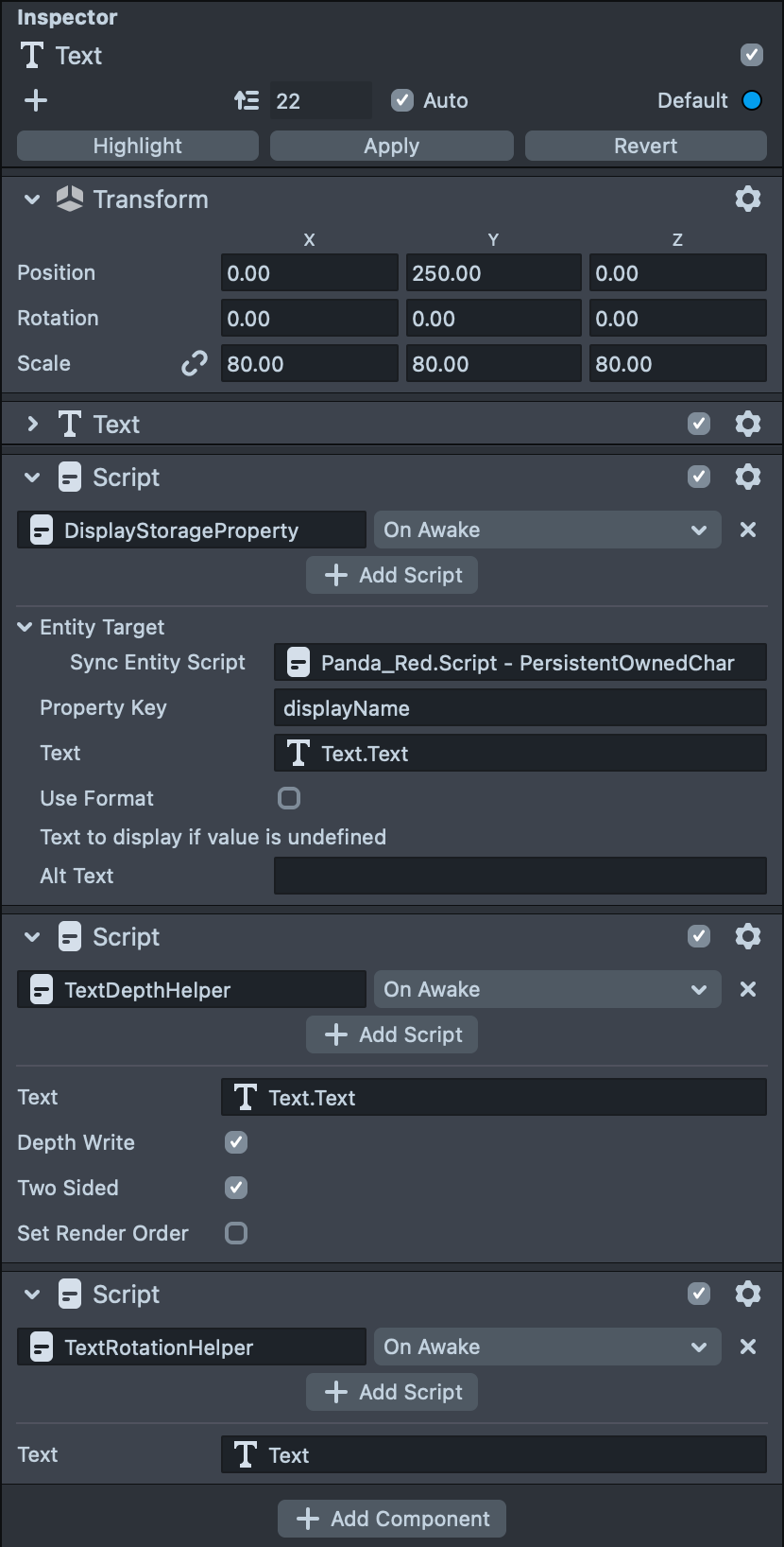 Each character prefab contains a text object displaying the user’s name. The template uses a DisplayStorageProperty, a Sync Framework helper script to share the user’s name across the network.