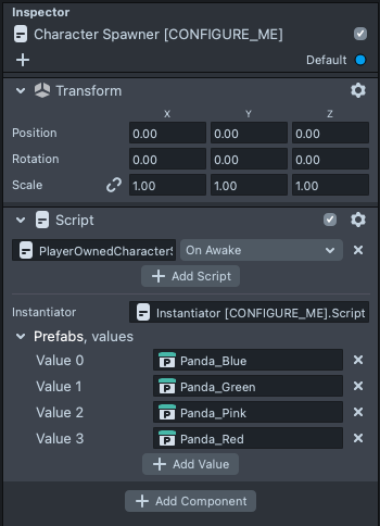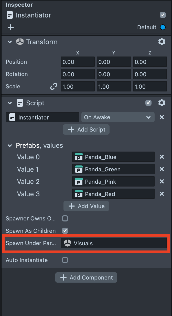 The instantiator instantiates prefabs across the network. In its input fields, make sure you have your character prefabs added just as how you added them for the PlayerOwnedCharSpawner script. For the input field "Spawn Under Parent", add the “Visuals” object to it, so that all characters will always be spawned as children of the “Visuals” object.