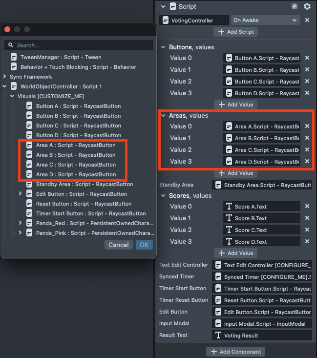 Notice here there is a matching number of Buttons and Areas. Each Button has a child text object describing the option. Each Area has a child text object representing the voting score on the option. You need to make sure that you have an equal number of those objects in order to make the voting session work as expected. You can replace these visual elements with assets of your own choice. Once you have your visual elements ready in the objects panel, you can continue to the next steps to set up these elements in your scripts’ input fields.
