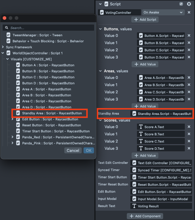Standby Area: This allows you to set up the standby area where the characters are initially instantiated when users first join a session. This is also an interactable area which users can tap on to cancel their vote during the session. When they cancel their vote, their character will move back to the standby area.