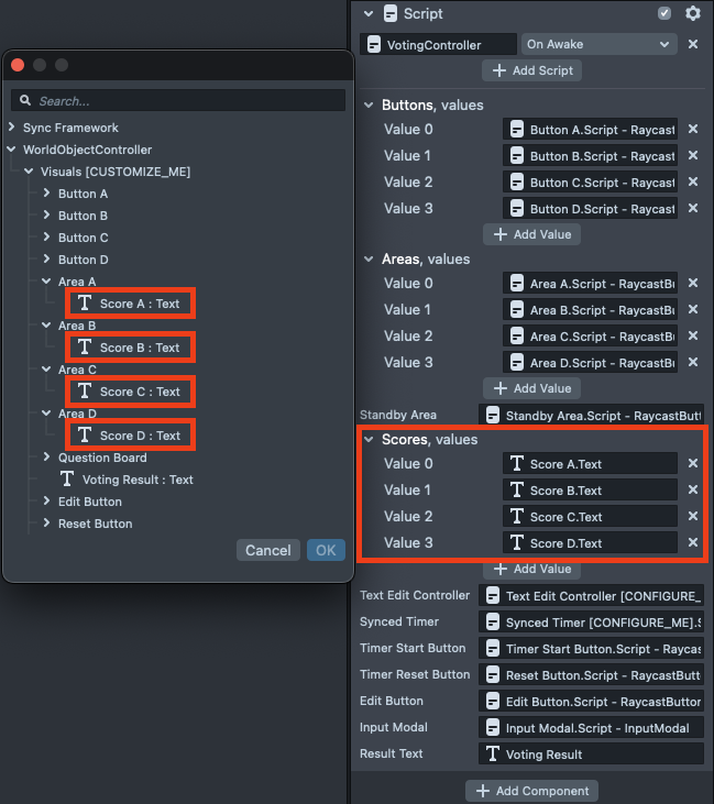 The Voting Controller is the script that syncs all users’ voting data throughout the session. If you click on the Voting Controller in the Objects panel, then navigate to the Inspector panel, you can see a few groups of input fields. You can replace the content in those input fields, however, make sure you add your Buttons, Scores and Options in matching orders, and that you have an equal number of them.