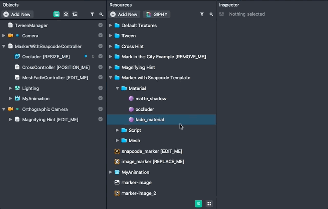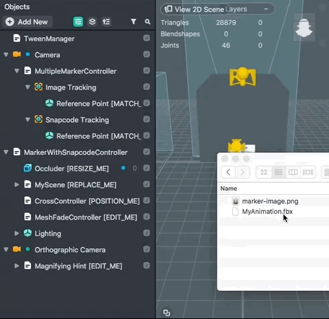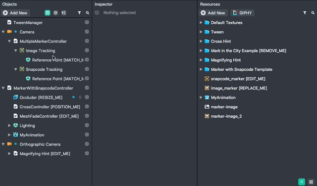 Once your content is imported, in the Objects panel, drag your content underneath the MarkerWithSnapcodeController. Then remove the object MyScene [REPLACE_ME].