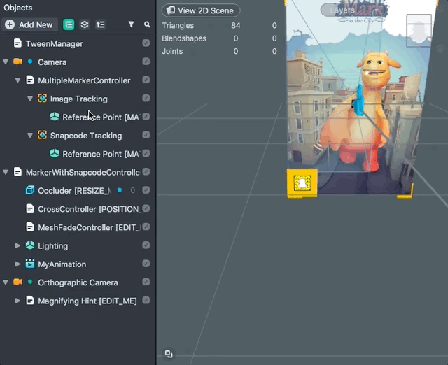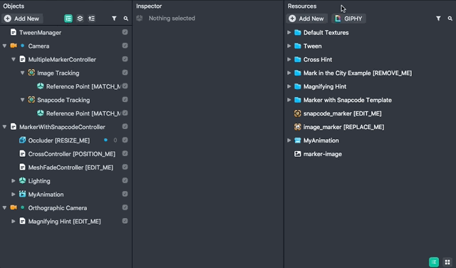 In some cases you may want to specify how your content should play. To do this, you can add a global function which the template will call based on the status of the marker tracker. One way to do this is to create a script on an object and set the script to run on Initialized. This template includes an example script which is attached to the MyScene object (found in the Resources panel under Mark in the City Example [REMOVE_ME] -> Scripts -> MySceneController.js).