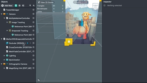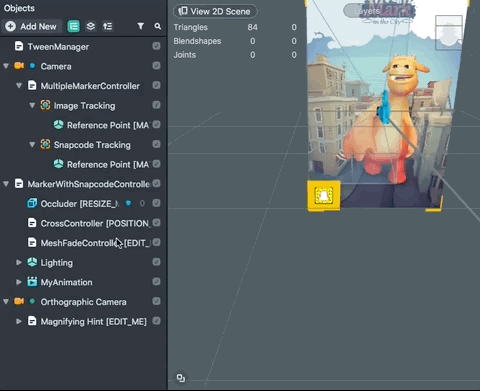 In the Objects panel, select CrossController [POSITION_ME], and in the Scene panel, use the move widget to move this object in the x and y coordinate to where your Snapcode Tracking object is.