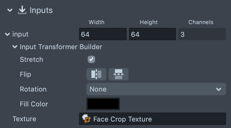 Our model was trained on the CelebaDataset that consists of the square images of people’s faces. We can use Face Crop Texture, which crops an area from Device Camera Texture based on a person’s face to feed similar input to our model.