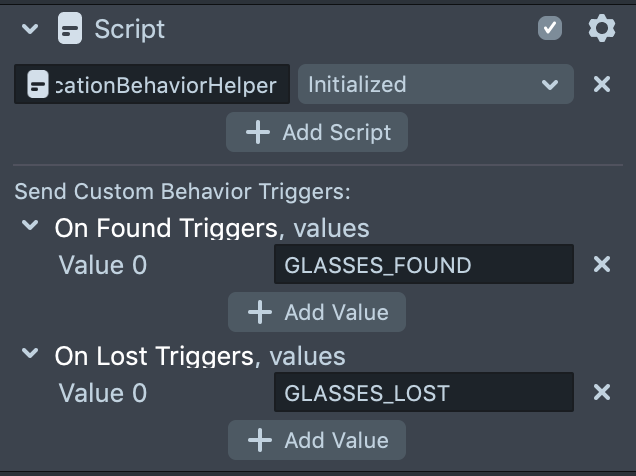 Head BindingsceneObject (which contains glasses 3D model) whenGLASSES_FOUNDcustom trigger is called. - The Second one enables