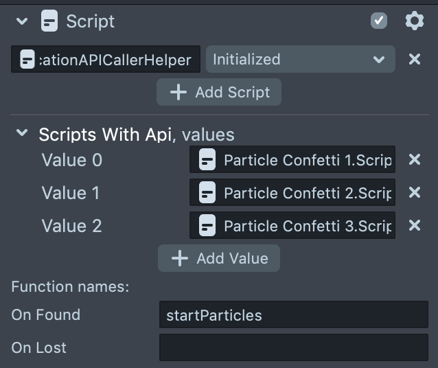 The Play Particles On Glasses Found example uses ClassificationAPICallerHelper. This script is useful to call api functions of other scripts. In this case it is used to call startParticles api function found on the ParticleController script.