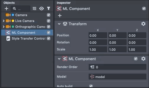 Next, we’ll tell the template to use this model. In the Objects panel, select ML Component. Then, in the Inspector panel, click on the field next to Model, and then in the pop up window, choose your newly imported model.