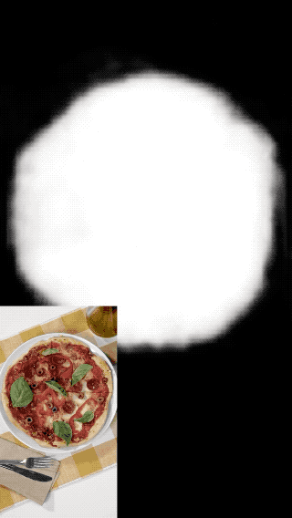 the heat_distortion material uses the segmentation mask to determine where the area should be grayscale (pixel is not pizza), and then uses the blurred segmentation mask so that the smoke noise can appear on top of the pizza.