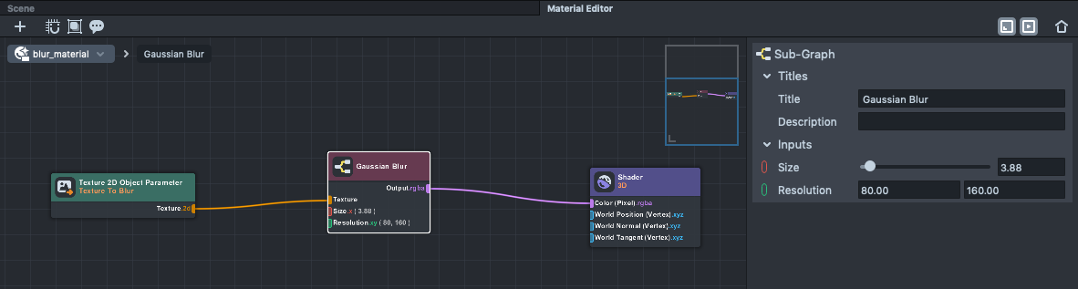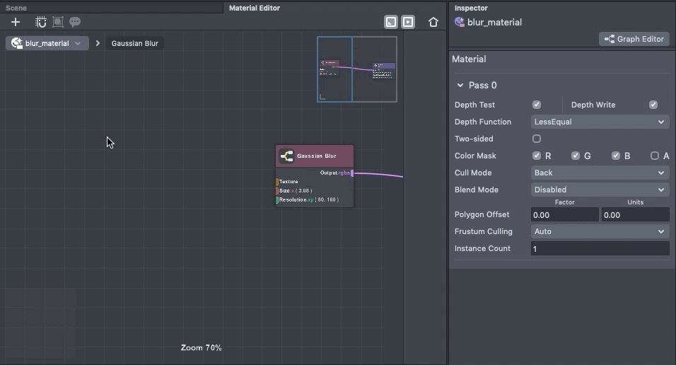 The blur_material takes in the segmentation texture and applies a gaussian blur to it using the gaussian blur subgraph.