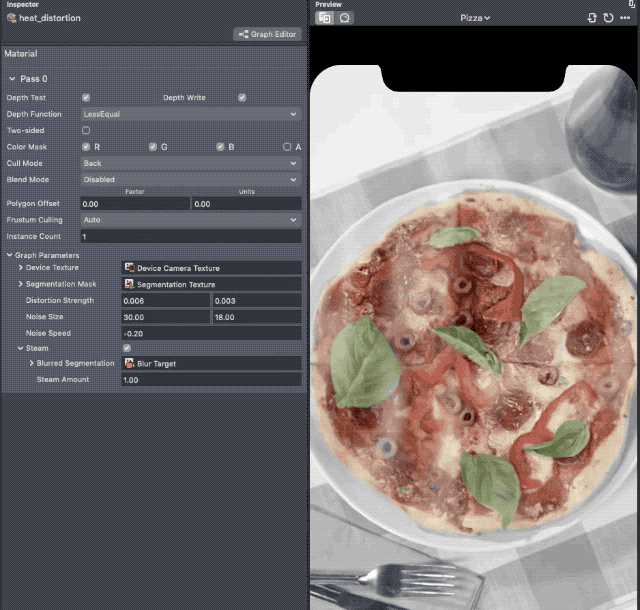 The Custom Segmentation template demonstrates an example of how you can apply an effect to a certain part of the screen based on a mask. The template comes with an example model for creating a mask on Pizzas, as well as a Graph Material which makes the pizza appear hot.
