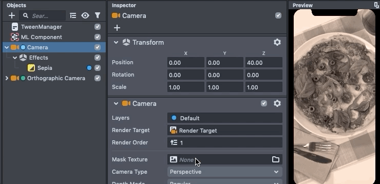 Then, you can select the Camera object, and use the Segmentation Texture from the ML Component as the Camera’s Mask Texture.