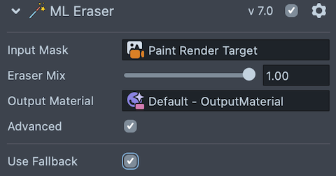 The ML Eraser Component contains various inputs that can be modified manually or via a script. It can be introduced to a project by dragging it from the resources panel onto a new Scene Object.