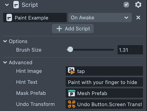 The Tap To Erase script places 3D spheres at the location of the user’s tap, with options to set the size of the sphere. You can combine multiple spheres together to form more elaborate masks.