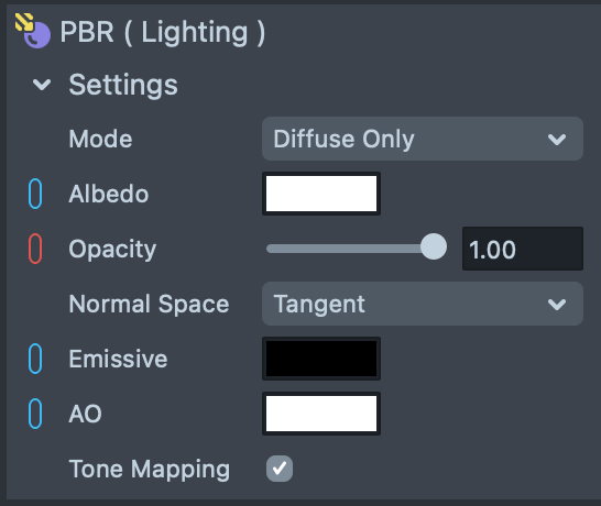 Add Node, type inPBRand press Enter. - Click on the new PBR node. In the Preview Panel set Mode from