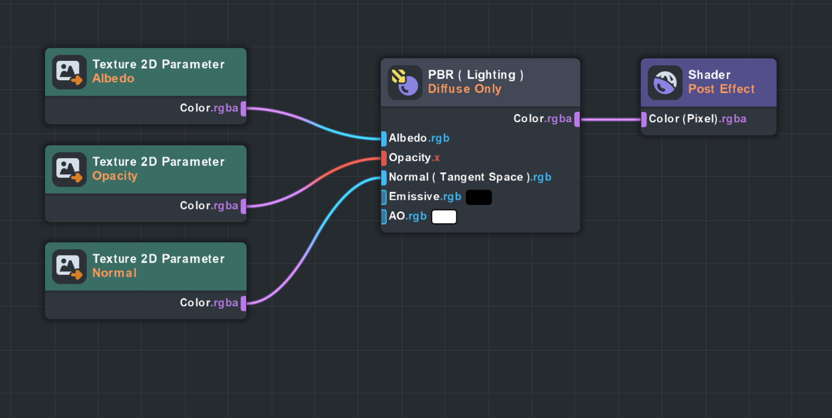 Albedo,Opacity, andNormal, respectively. - Connect the Texture 2D Parameter nodes to their corresponding slots in the PBR Node.