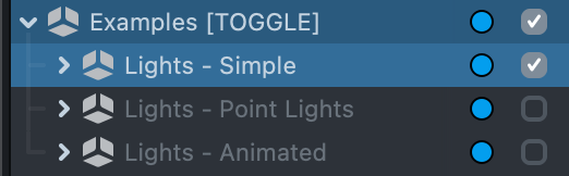Once the Template has loaded. Look in the Objects Panel and navigate to the Examples [TOGGLE] Scene Object. These examples show how to create lighting setups that range from simple to complex. Feel free to explore these examples by enabling one at a time.
