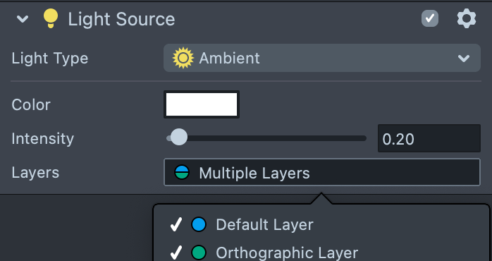 Select the Light Scene Object. Rename it to Ambient Light. In the Inspector Panel, change the Light Type from Directional to Ambient and adjust the Intensity slider to 0.2. Feel free to play with the Color and Intensity parameters to see how the effect responds to the Light settings.