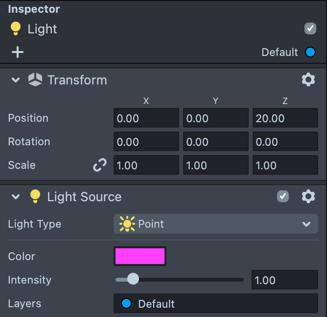 +button in the Objects Panel and selectLight. Rename this new light toPoint Light. - In the Inspector Panel, set the