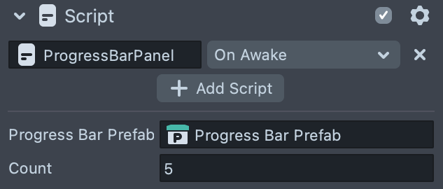Progress Bar Prefab: an object prefab that contains several Scene Objects and a ProgressBar script.