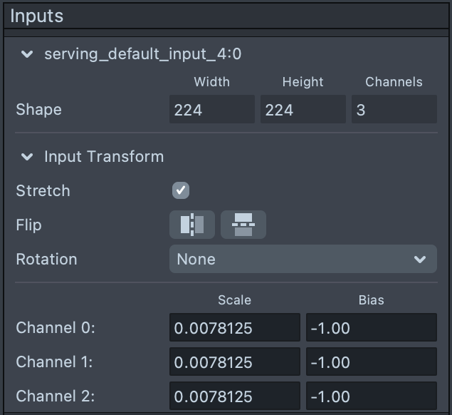 Please note that Lens Studio reads pixel values between 0 and 255 and our model uses range [-1, 1] we need to set the scale and bias when importing our model. To transform [0, 255] range to [-1, 1] we need to divide 1 by 128 and subtract to, that results in the next setting:
