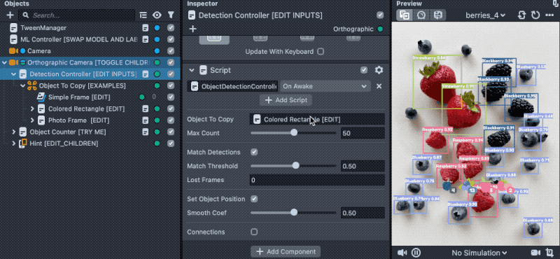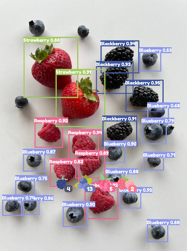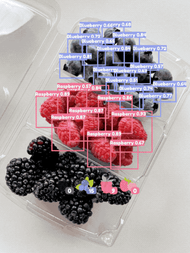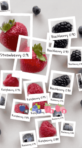 The Multi-Object Detection Template comes up with a dedicated Berry Detection machine learning model that allows to classify and detect four different kinds of berries on the user's screen; Blueberry, Strawberry, Blackberry and Blueberry