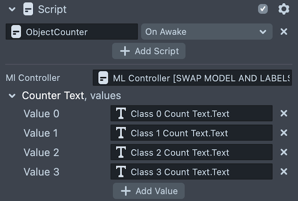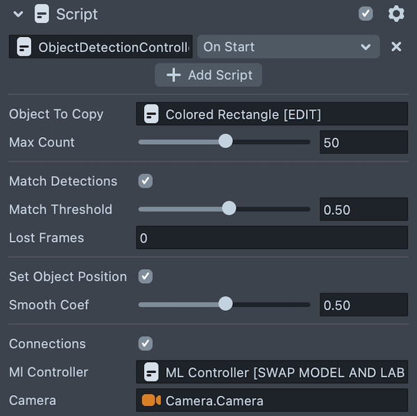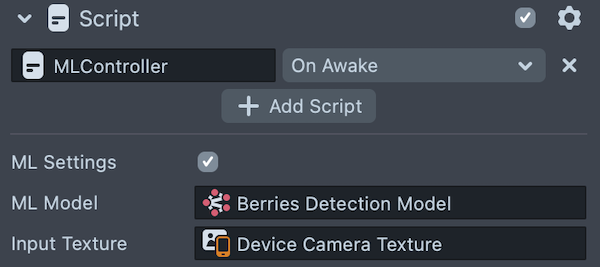 This template is controlled by of two main scripts: Ml Controller and ObjectDetectionController that are attached to scene objects with corresponding names.