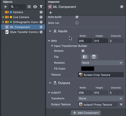 First, take a note of the input and output parameter in the ML Component. This should be the same as what the notebook has specified. Then, select the Style Transfer Controller object in the Objects panel, and in the Inspector panel, type in Input name and Output name as it is shown in the ML Component.