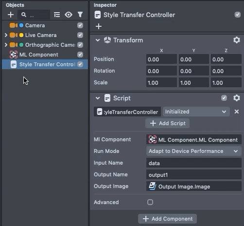 With our model hooked in, what we need to do now is to tell the Style Transfer Controller to connect to our Style Transfer model.