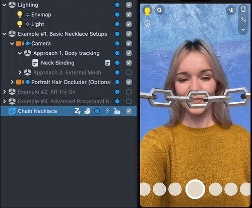 The Necklace Try-On Template offers a quick way for you to get started with Necklace based AR Try-On Lens experiences and how you can add some additional features to enhance the user experience.
